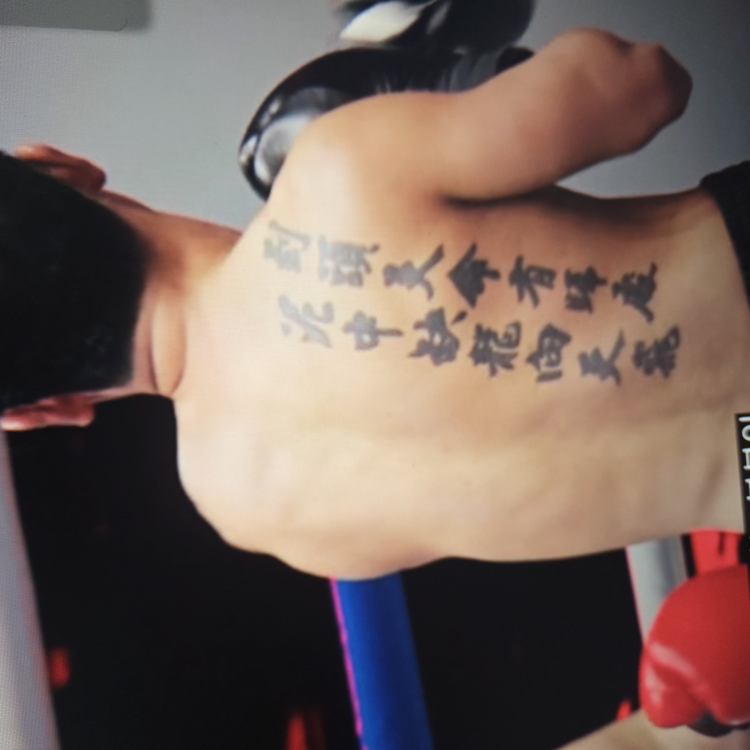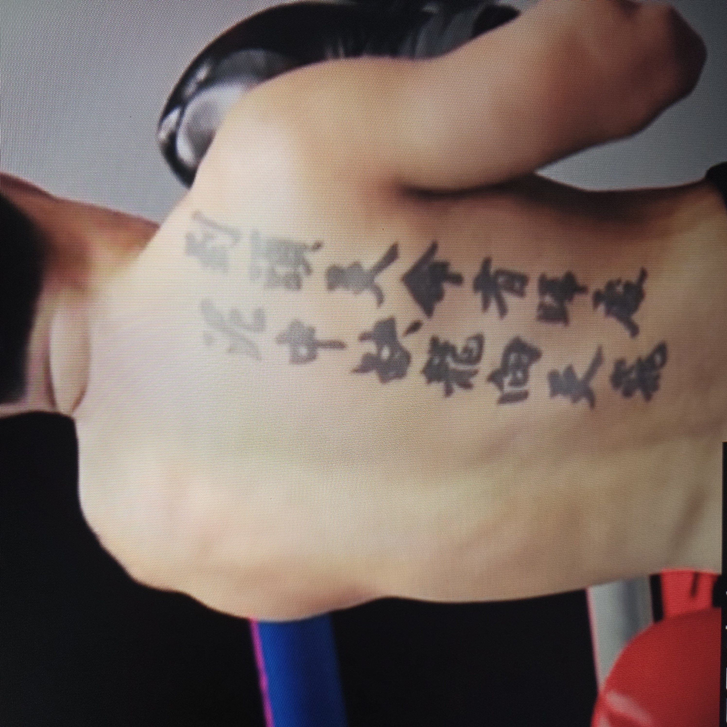 사진에 보이는 등판 문신은 세로로 두 줄의 한자 문구예요. 흔히 무도·권투 쪽에서 많이 쓰이는 문구 조합입니다.